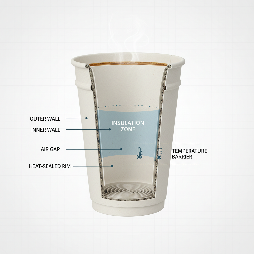 Double wall cups feature an inner cup (similar to a single wall) wrapped with an additional outer layer of paperboard. Crucially, manufacturers leave a small air gap between these two layers.