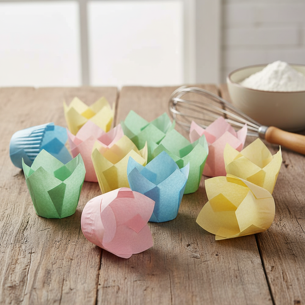 A vibrant collection of pastel-colored paper baking cups, ideal for adding a cheerful and festive touch to your homemade cupcakes and muffins.
