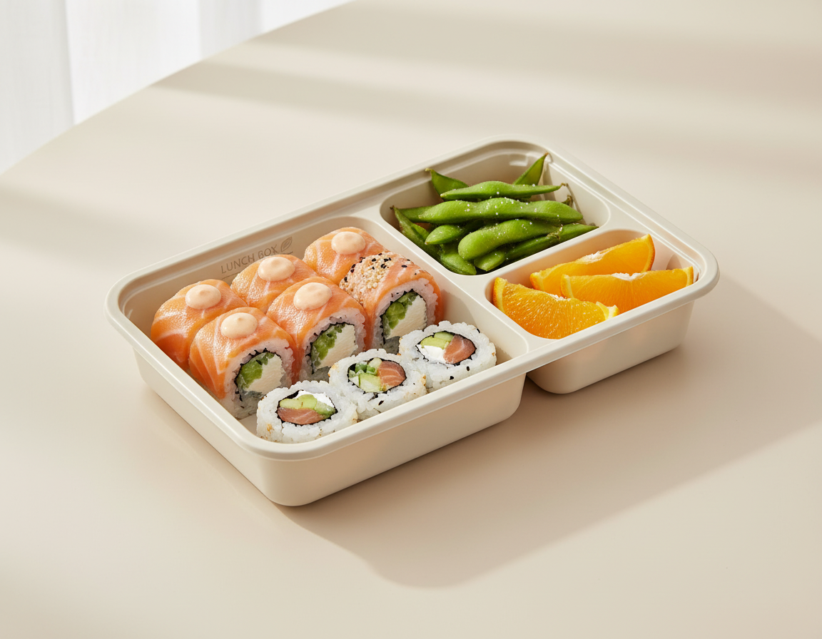 Innovative multi-compartment plastic bento tray for packing diverse and balanced lunches, keeping different food items separate and fresh.
