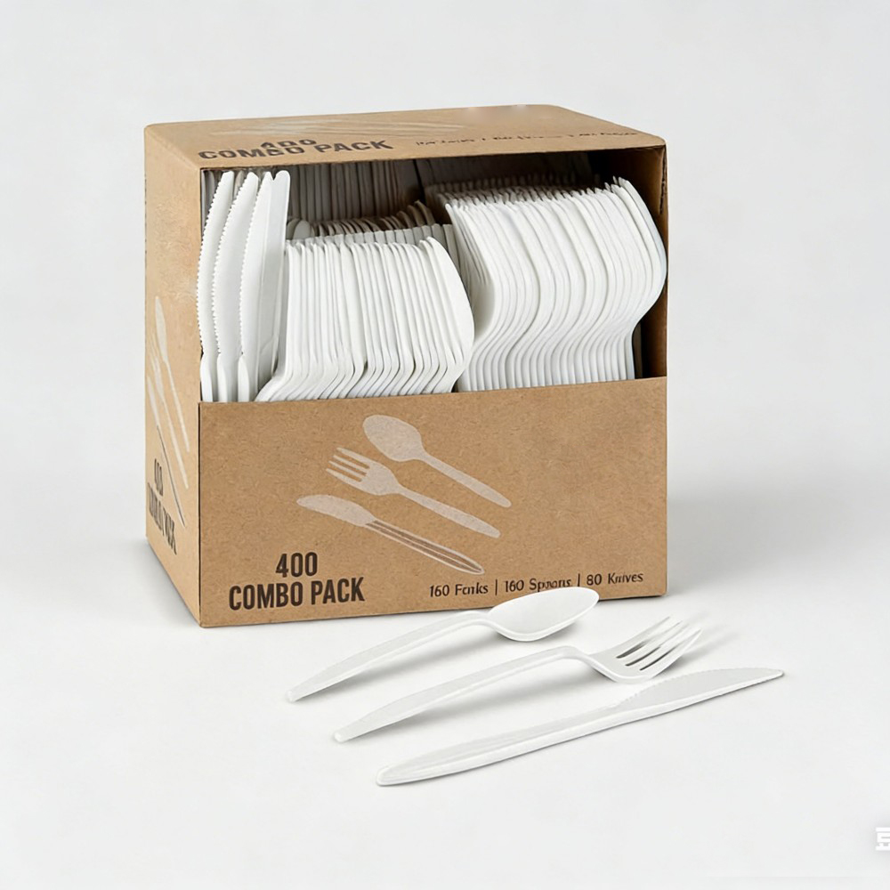 Eco-conscious cutlery set crafted from plant-based materials, perfect for large gatherings and outdoor events. Features a smooth finish and sturdy design.