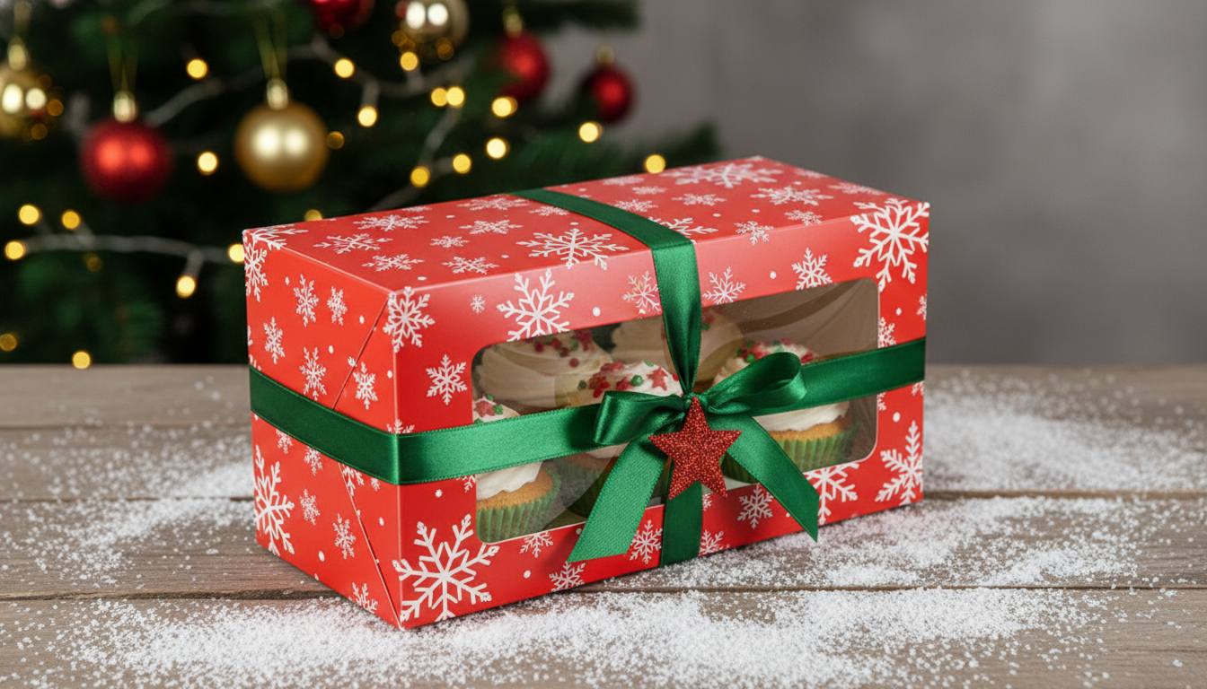 Festive red cupcake box with snowflake design and clear window, perfect for holiday treats and gifts.
