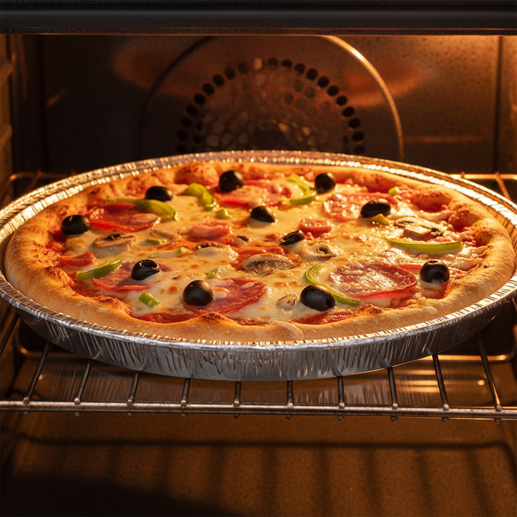 Robust aluminum foil pizza tray, ideal for high-temperature baking, ensuring even cooking and easy cleanup without sticking.
