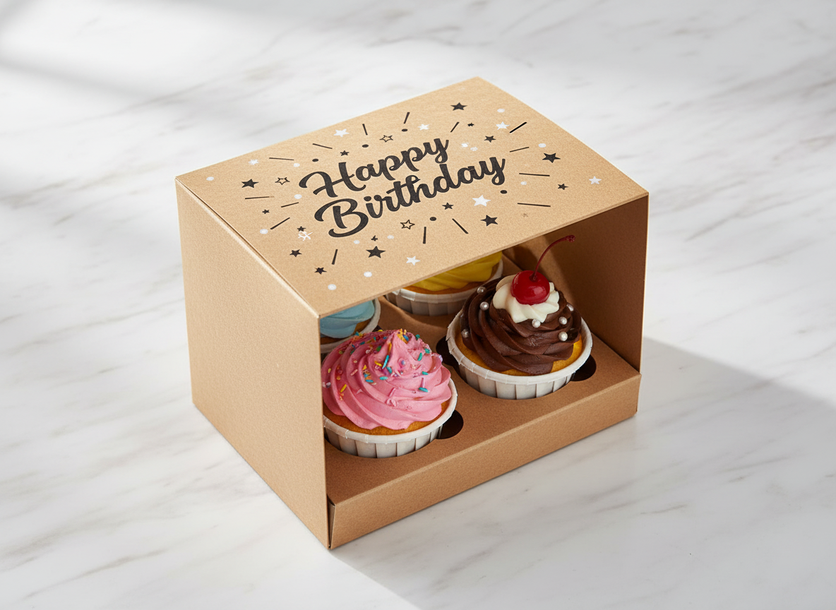 A charming kraft paper cupcake box, perfect for birthday celebrations. Features a ‘Happy Birthday’ print and festive patterns, with secure inserts for safe transport of your delicious treats.