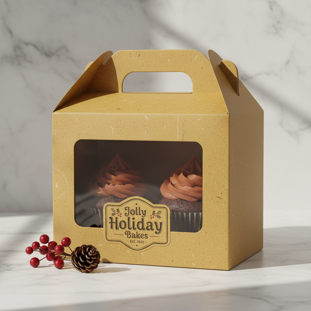 Rustic muted gold cupcake box with a handle, ideal for Christmas baked goods. Features a vintage English logo and charming natural accents.