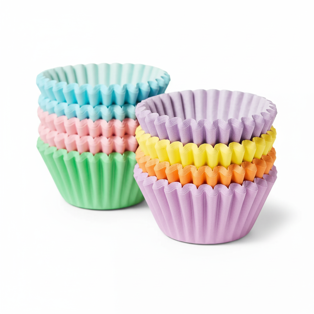 A stack of pastel-colored baking cups (light blue, mint green, soft pink, lavender, pale yellow) arranged neatly on a pure white background, shot from a slightly elevated angle, emphasizing the gentle color transitions.