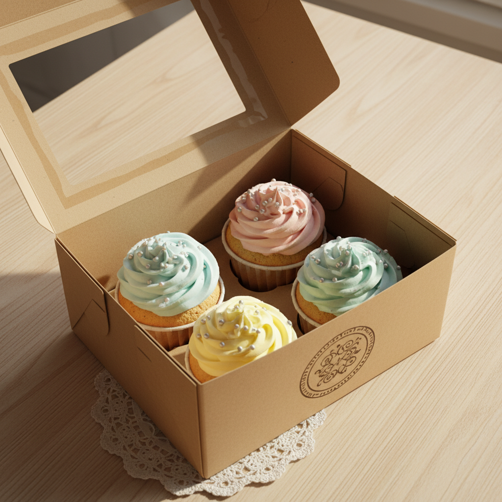 Charming custom-branded cupcake box crafted from eco-friendly kraft paper, ideal for artisanal bakeries or heartfelt homemade gifts.