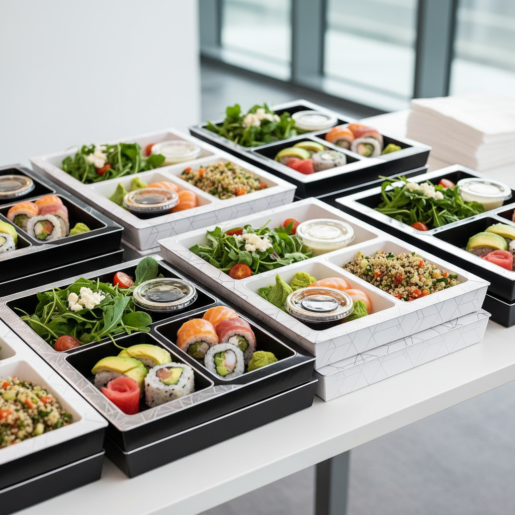 Modern and professional paper trays designed for corporate catering, grab-and-go meals, and upscale fast-casual dining. Offers a refined look.