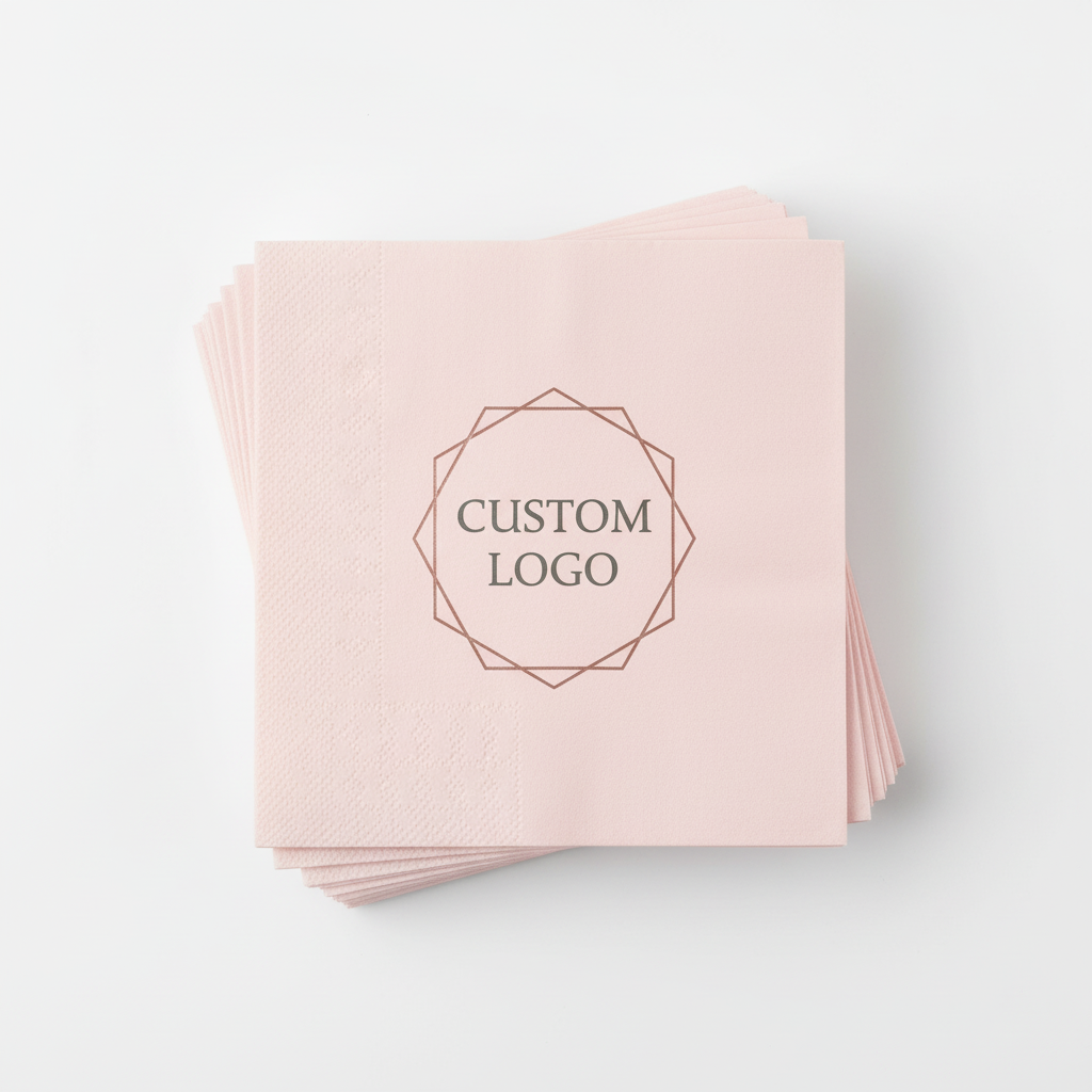 Disposable pastel pink napkins, perfect for elegant events and branding. Each napkin features a customizable ‘Custom Logo’ imprint.