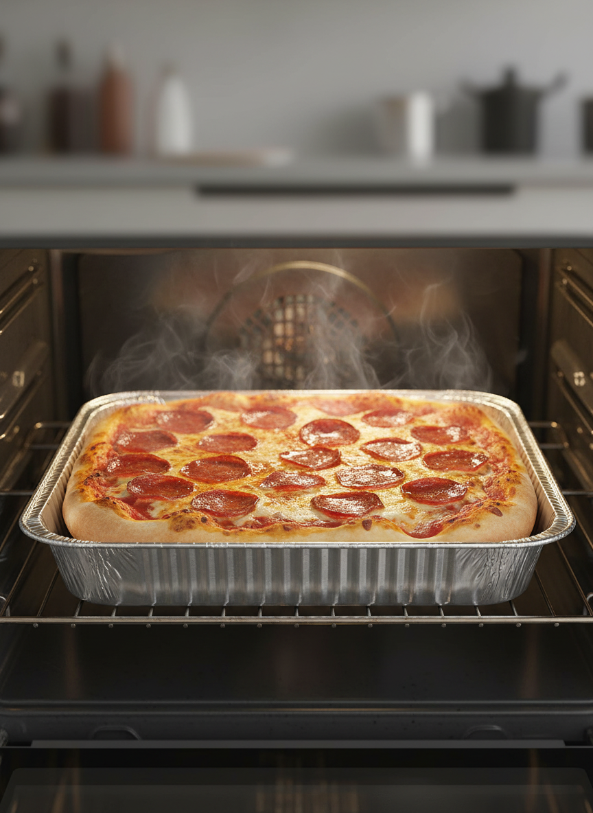 Durable square aluminum foil tray perfect for baking and serving homemade pizzas with easy cleanup.
