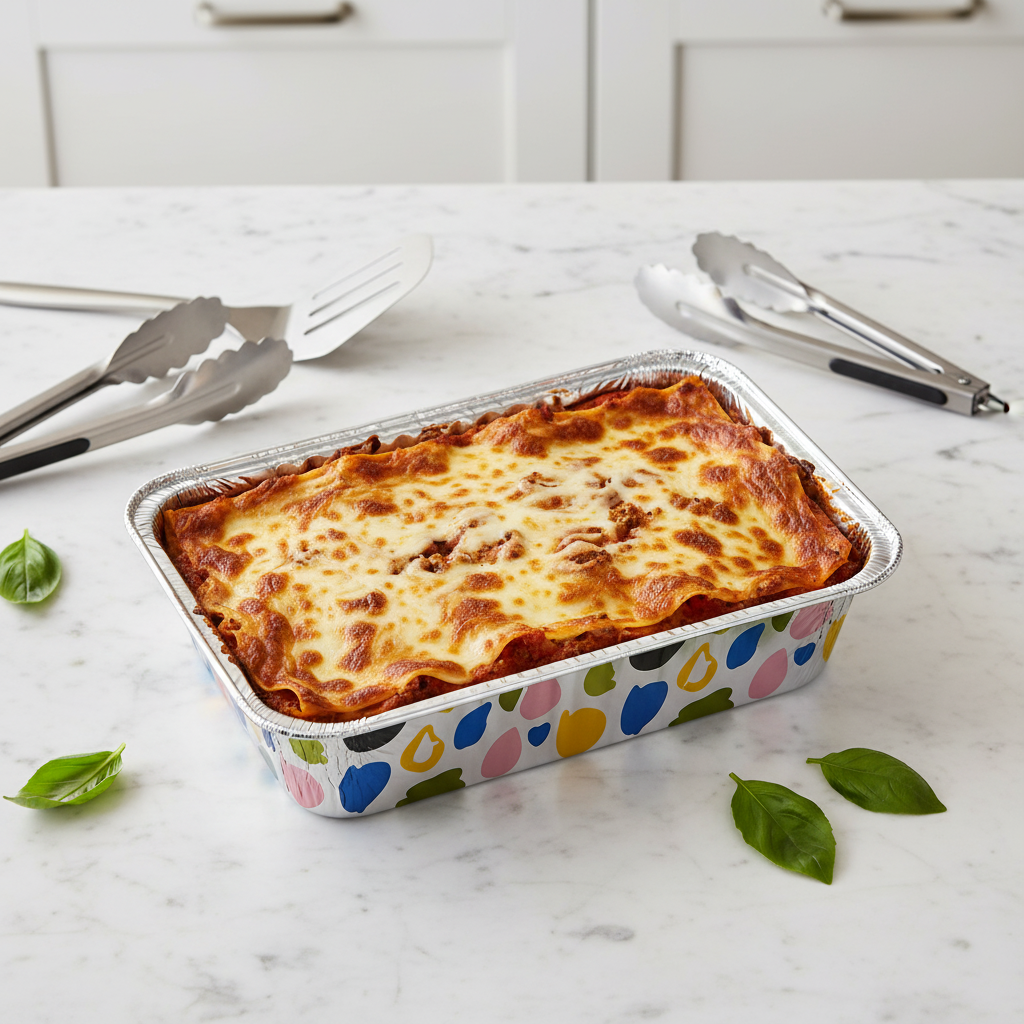 Sturdy aluminum foil pan with a modern geometric design, ideal for roasting, casseroles, and party servings.