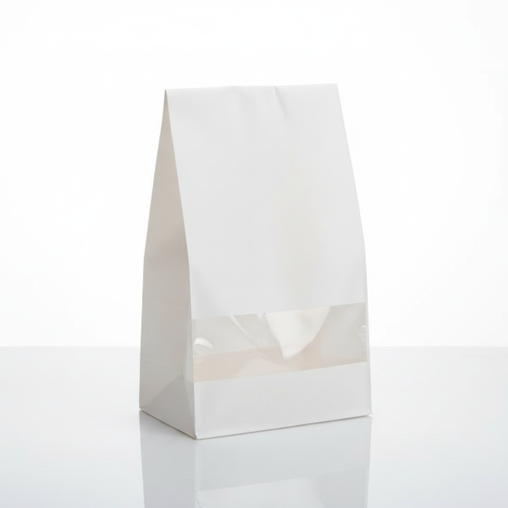 Showcase your products uniquely with this white PE coated bag featuring a transparent bottom panel. This design allows for an intriguing view of the contents, while the PE coating guarantees freshness and a clean, professional look for your goods.