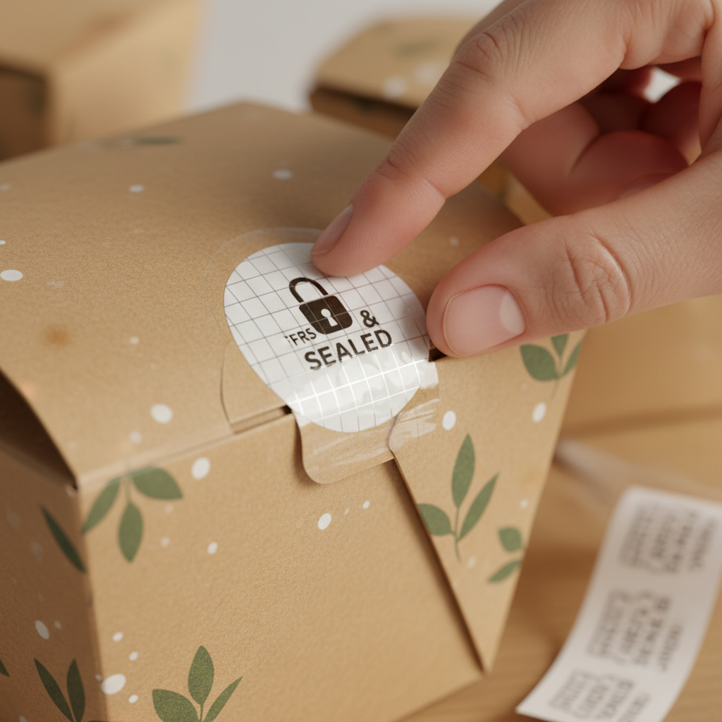 • Void Material: When peeled, these plastic-based labels leave a residue pattern (typically saying “VOID” or “OPENED”) on the packaging surface. This is high-security but less common in low-cost food delivery due to the higher unit cost.